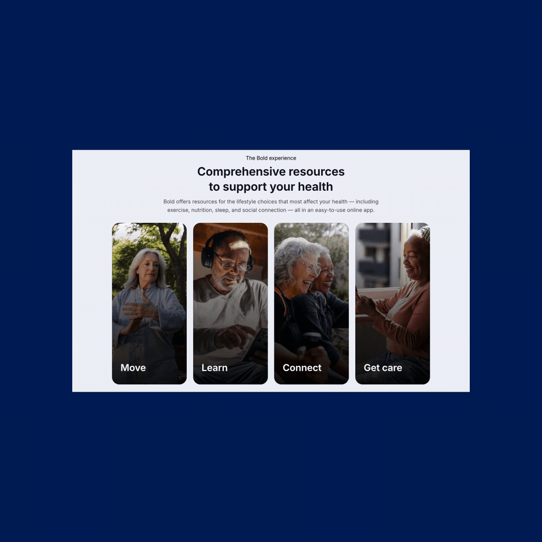 THE SOLUTIONI refined the existing typography styles to allow for stronger hierarchy and more expressive headlines, expanded color usage to provide warmth and higher contrast, and introduced lifestyle-forward imagery to balance the tech and clinical credibility. In the end, Bold had a landing page that felt distinctly more human, modern, and confident as well as a scalable brand foundation that reflected their evolution as a company.