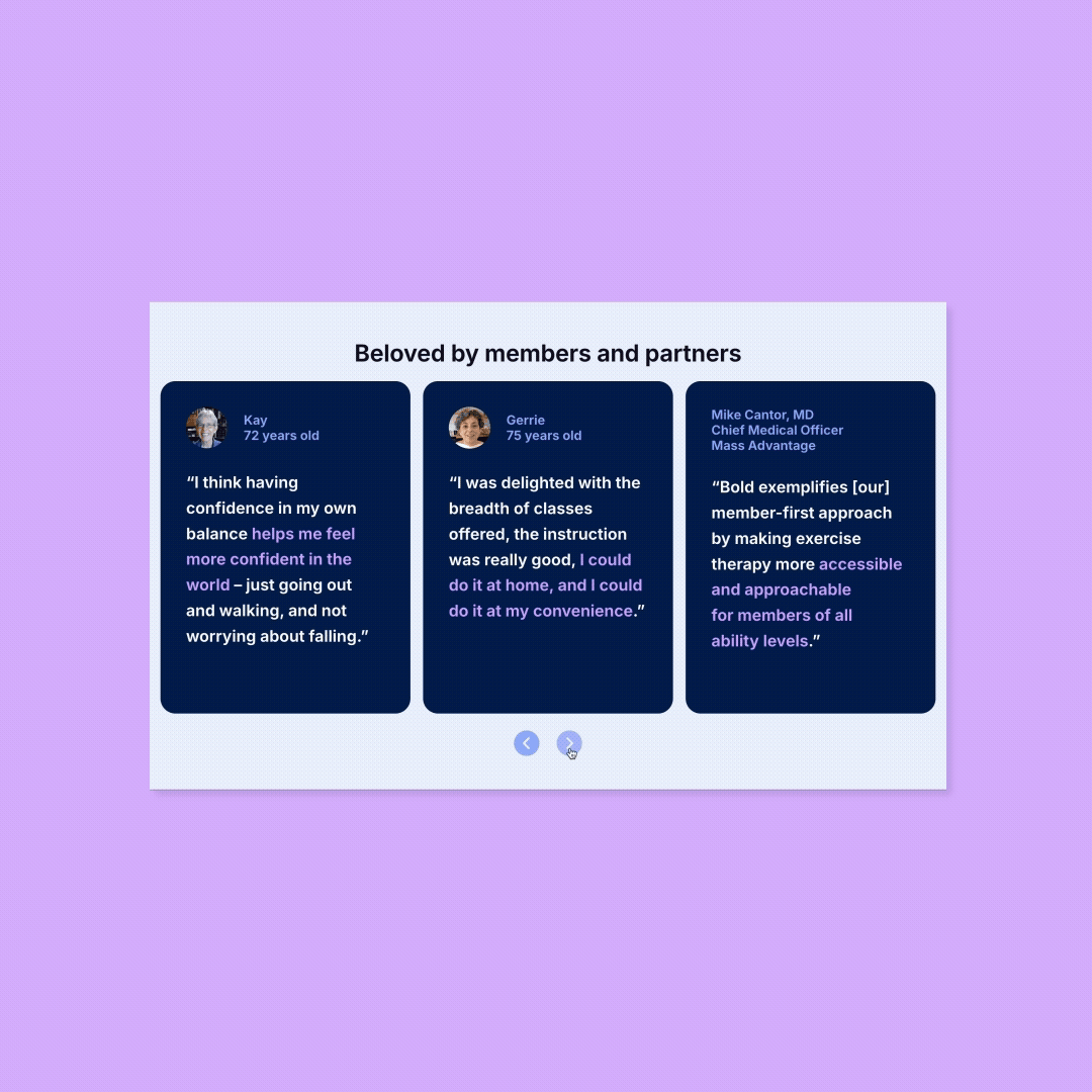 Bold is a digital health company focused on healthy aging for seniors. They offer content and workouts that improve balance and strength to help prevent falls and manage chronic conditions.